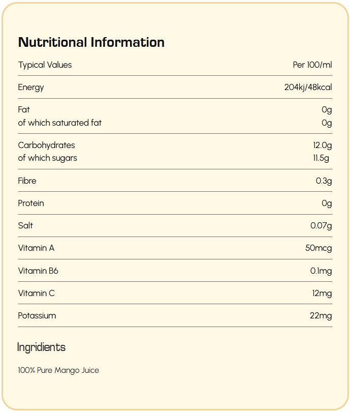 Our mangoes are handpicked from our farms and go through a careful process to ensure you get the purest juice. Each mango is washed, peeled, cut, and then gently juiced. We then filter, heat, and fill it into our 320ml cans, nothing added, just pure, tropical mango goodness. Each case contains 12 cans, ready to be refrigerated, shaken, cracked open, and enjoyed.